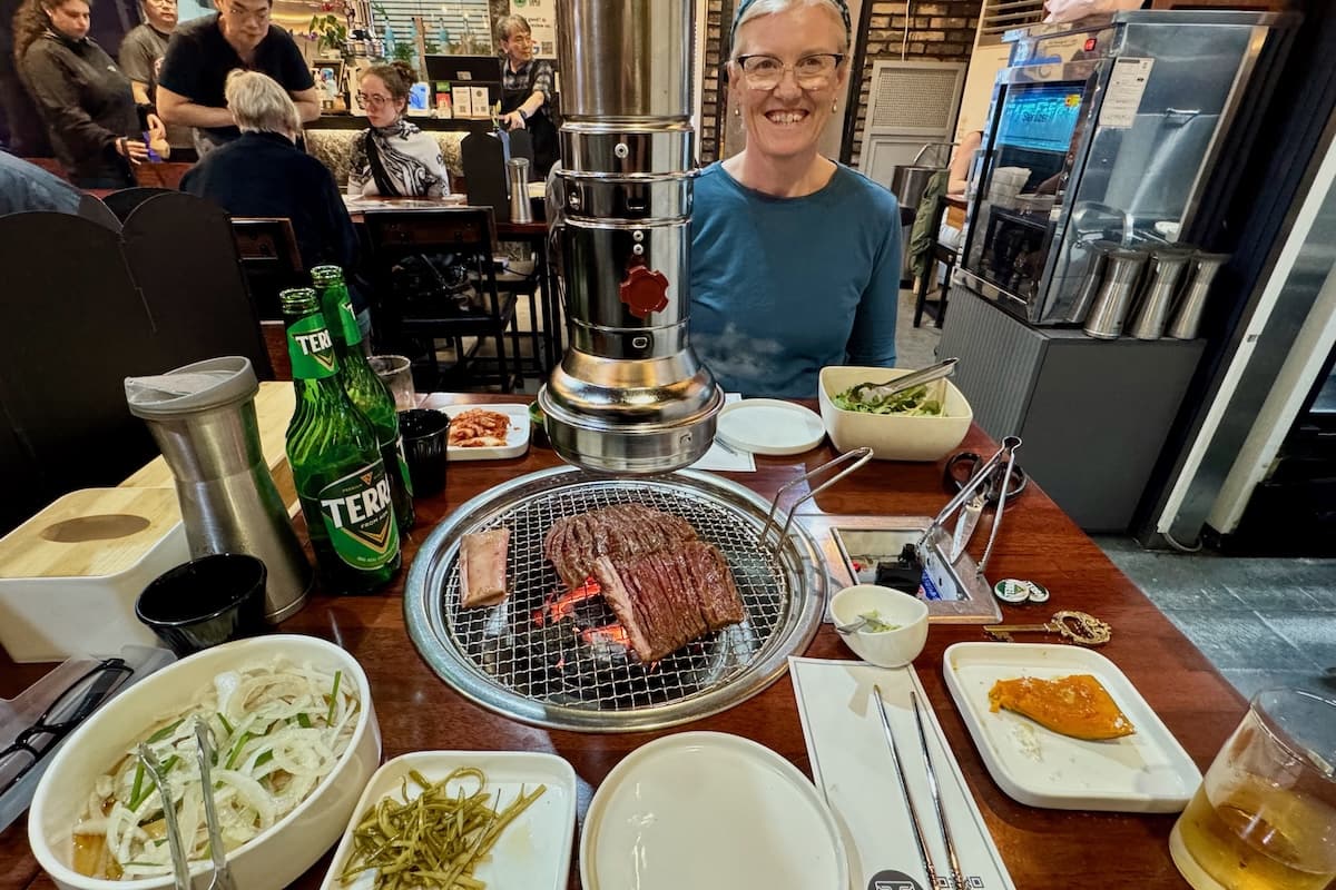Dinner was a full tabletop BBQ affair. Marinated ribs joined by bulgogi — paper-thin slices of beef soaked in a sweet pear-and-soy marinade — sizzled over a charcoal grill set into the table.